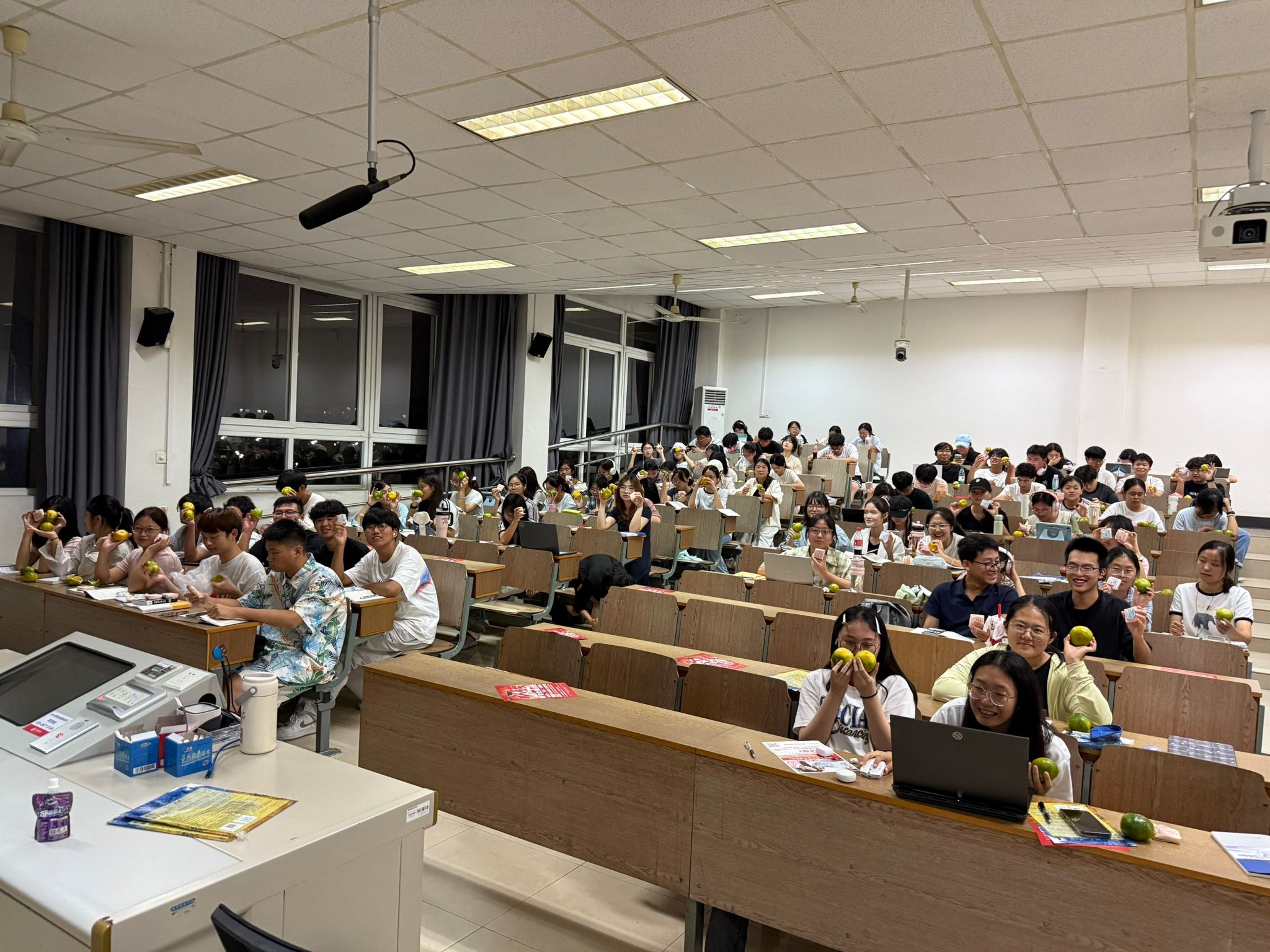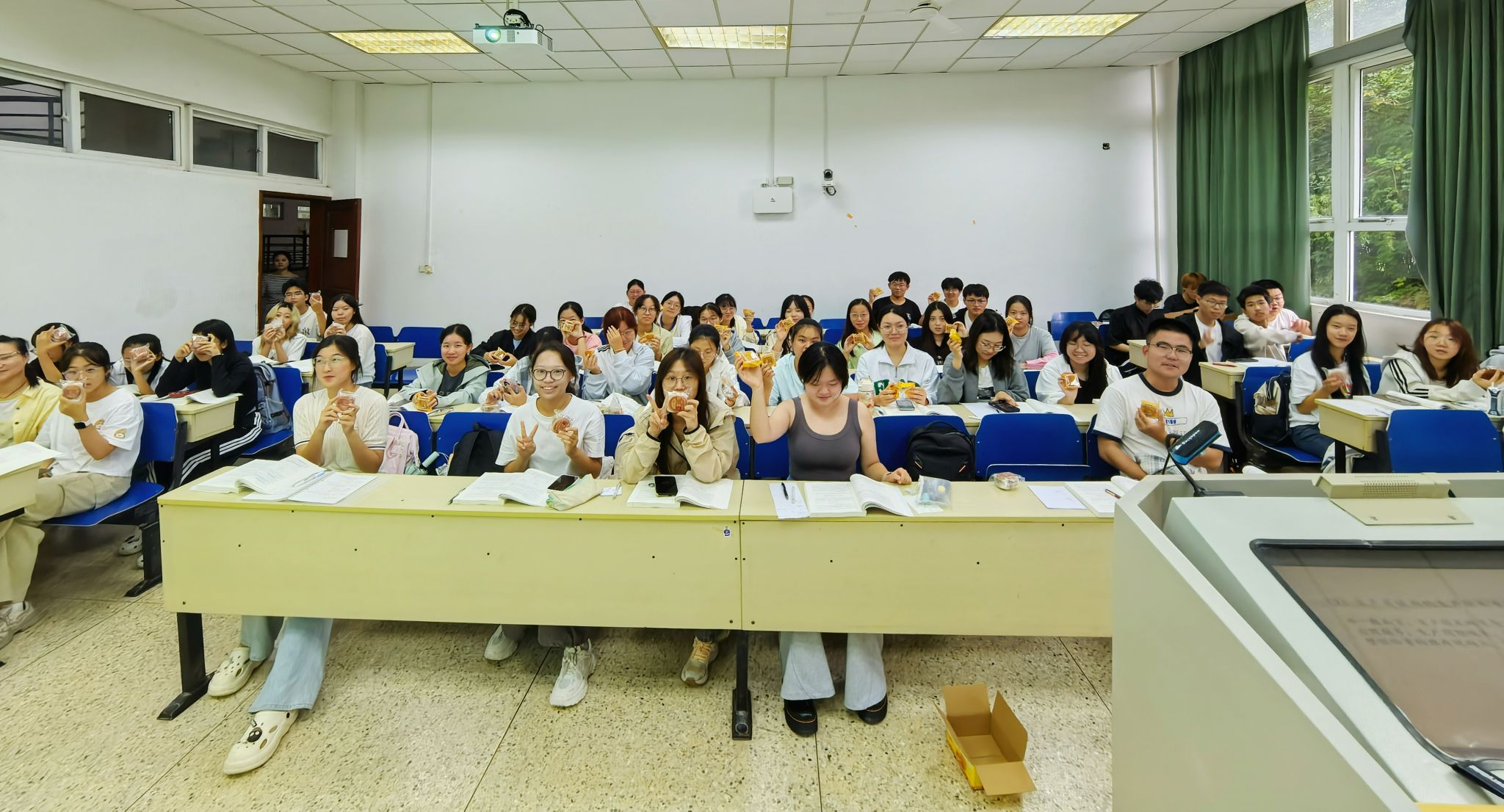 课桌上,月饼的香甜与水果的清新交织,摆着的不仅是舌尖的美味,更是学院沉甸甸的关切 —— 是怕异乡学子念家,特意准备的 “团圆味”,是想让每个人都能在校园里尝到节日的暖意。拿到这份惊喜的同学们,嘴角忍不住上扬,灿烂的笑容里,藏着对这份甜意的喜爱,更藏着被学院记挂的动容,那笑意落在眼底,比窗外的秋日阳光更显温暖。